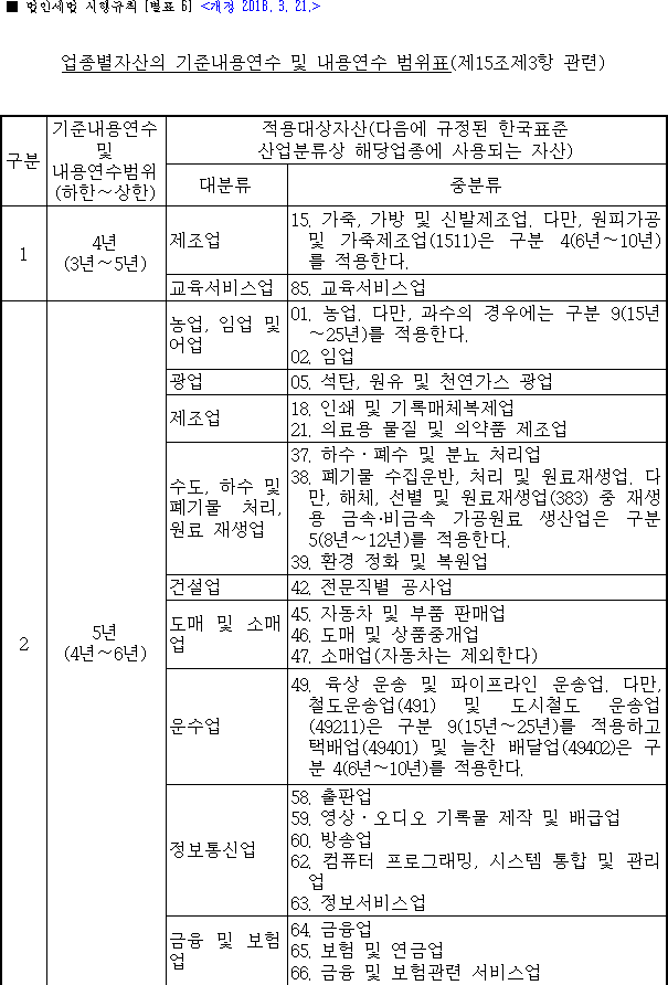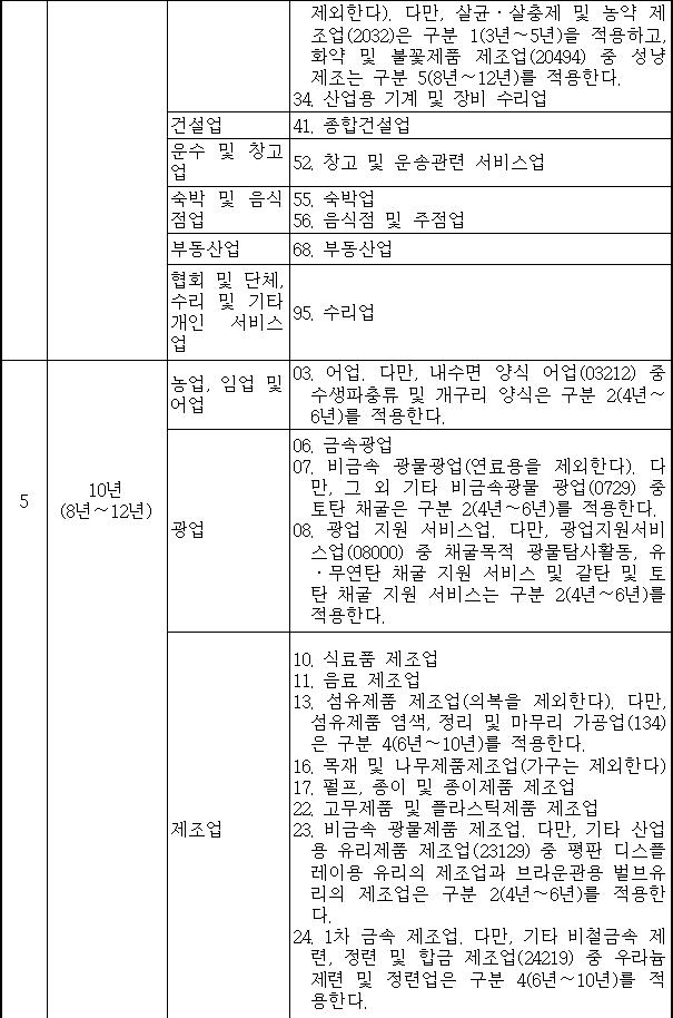 감가상각기간의 기준이 되는 자산의 효용이 지속되는 기간, 즉 '사용가능 햇수'를 말한다. 기업회계에서는 내용연수에 대한 추정을 허용하고 있으나, 법인세법에서는 기업의 내용연수 선택을 일정한 기준으로 제한하고 있다. (참고: 법인세법 시행규칙 별표 2,3,5,6)