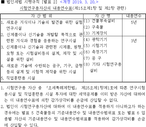 참고로, 세법에는 법인의 감가상각비용의 자의적 계산 방지를 위해 감가상각 대상자산, 내용연수, 상각방법 등을 규정되어 있고 이 기준을 초과한 감가상각범위금액은 손금(손상)으로 인정되지 않는다. 또한 감가상각비는 회사가 장부에 반영을 한 경우에만 비용으로 인정되므로 결산조정시 반드시 장부 반영을 해야 한다.